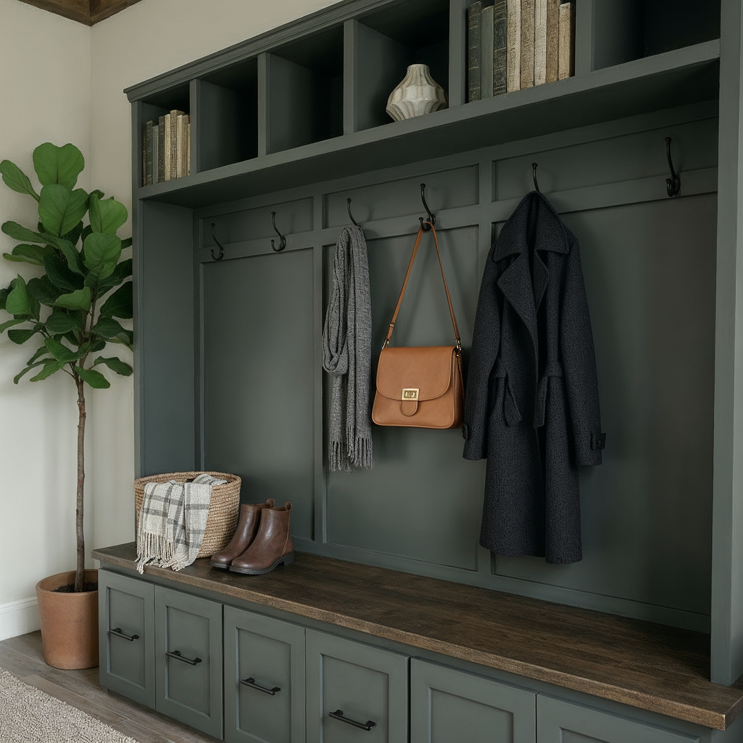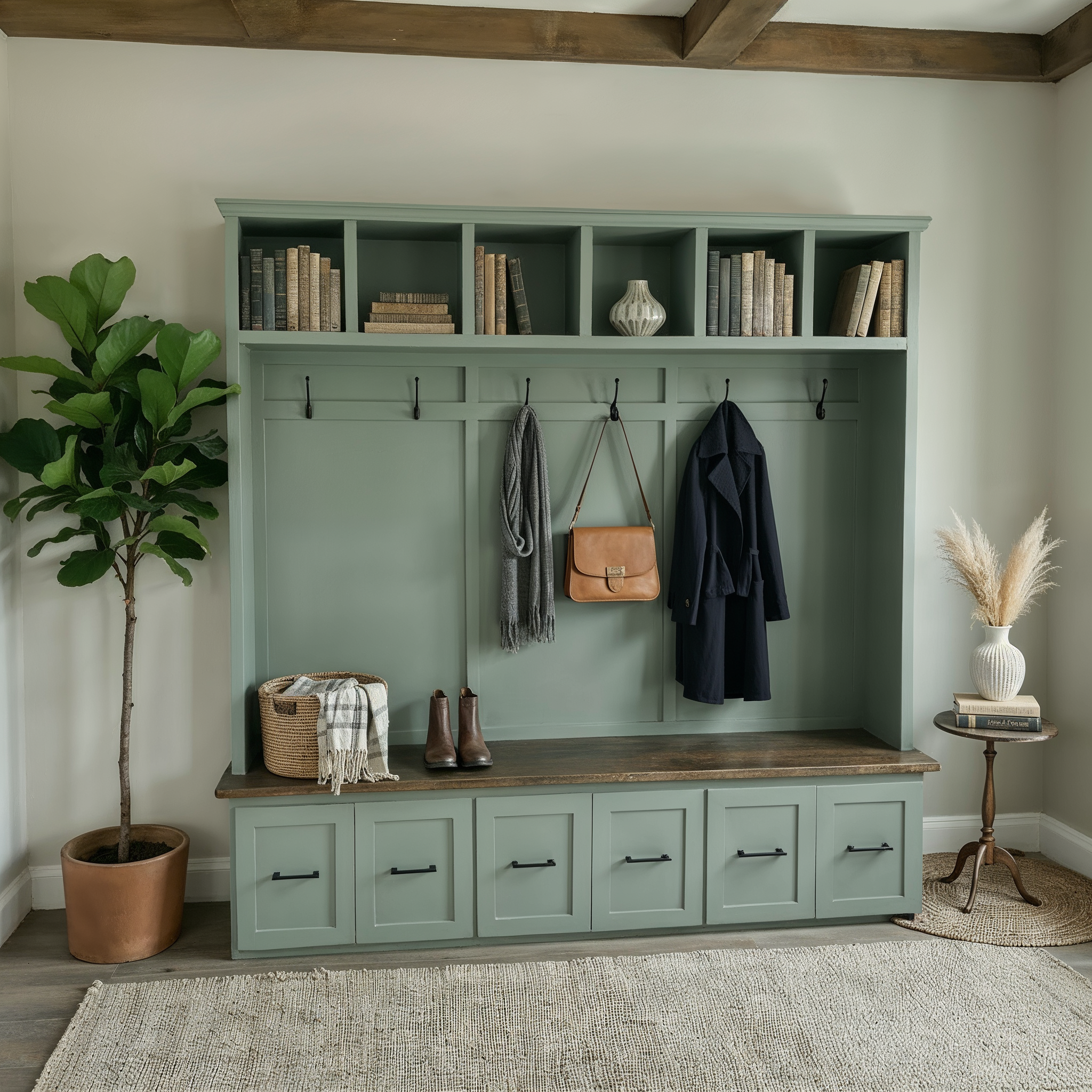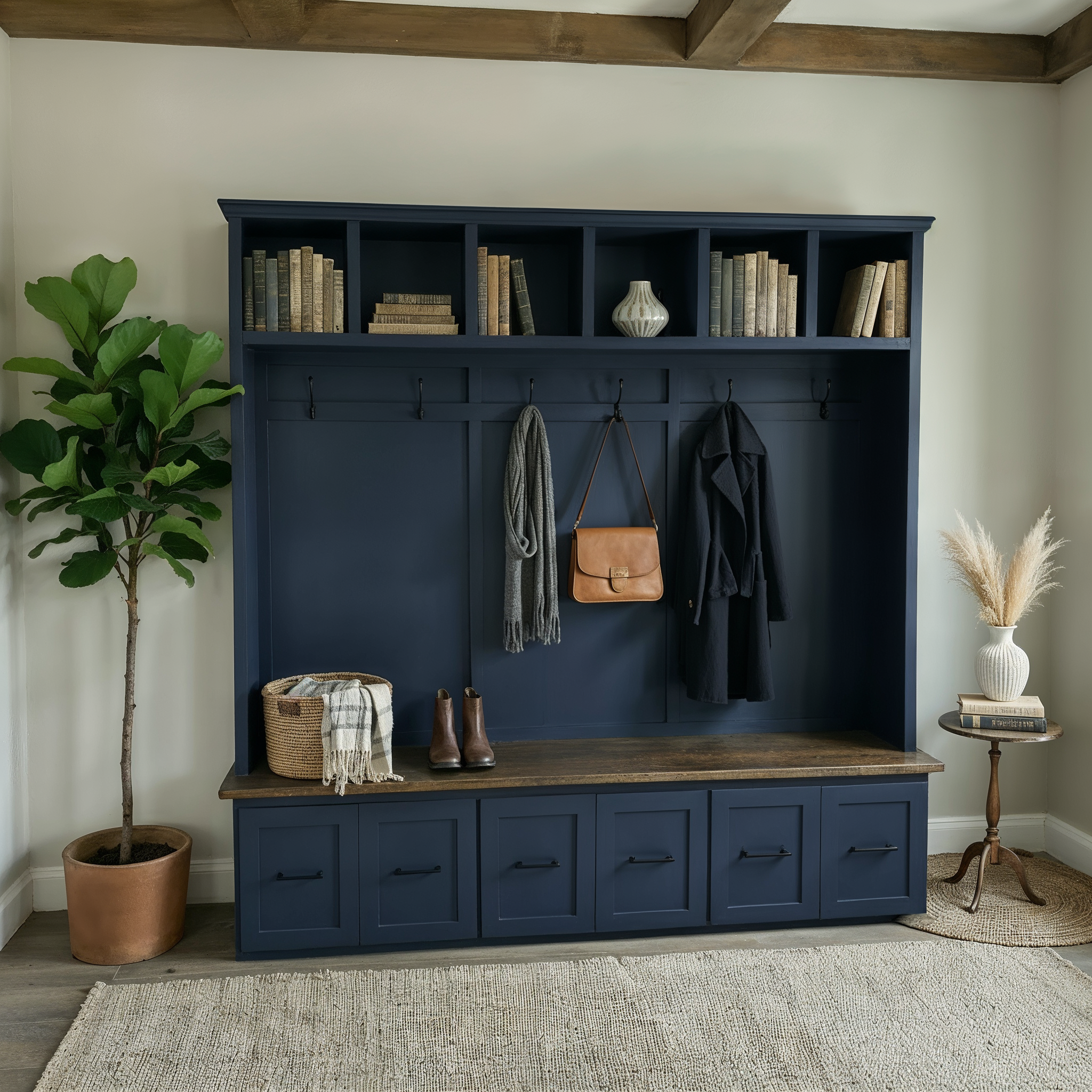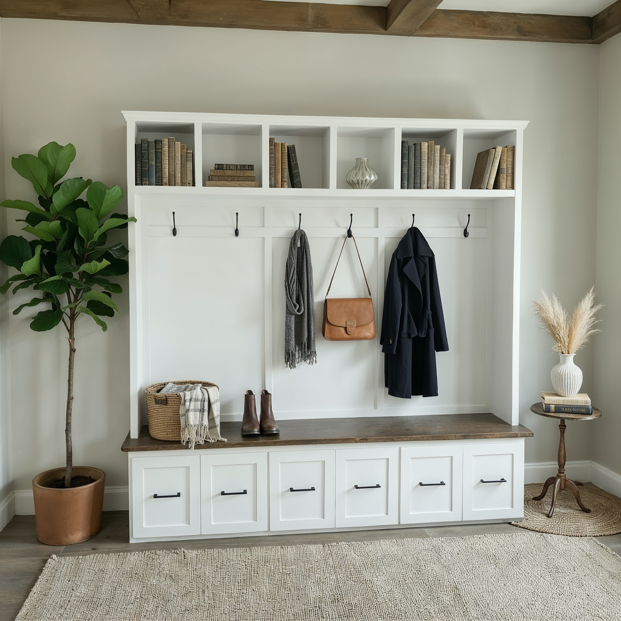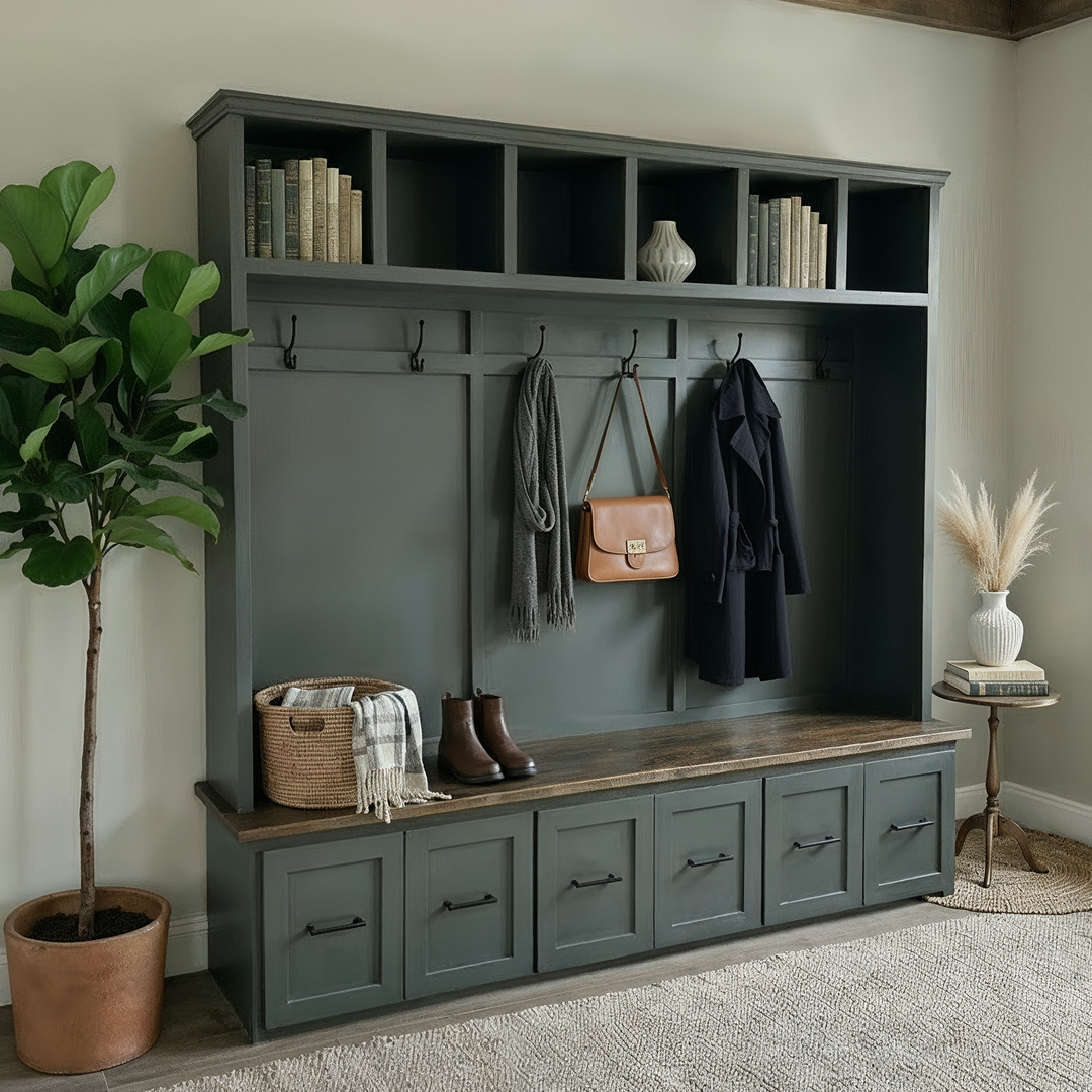 This hall tree offers a sophisticated and practical solution for organizing your entryway with timeless farmhouse appeal. Each piece is handmade by our own craftsmen using domestic hardwood faceframe material and cabinet plywood. Hidden behind the doors and drawers you will find ample space to store your family's bags, coats, shoes, hats, scarves and more.