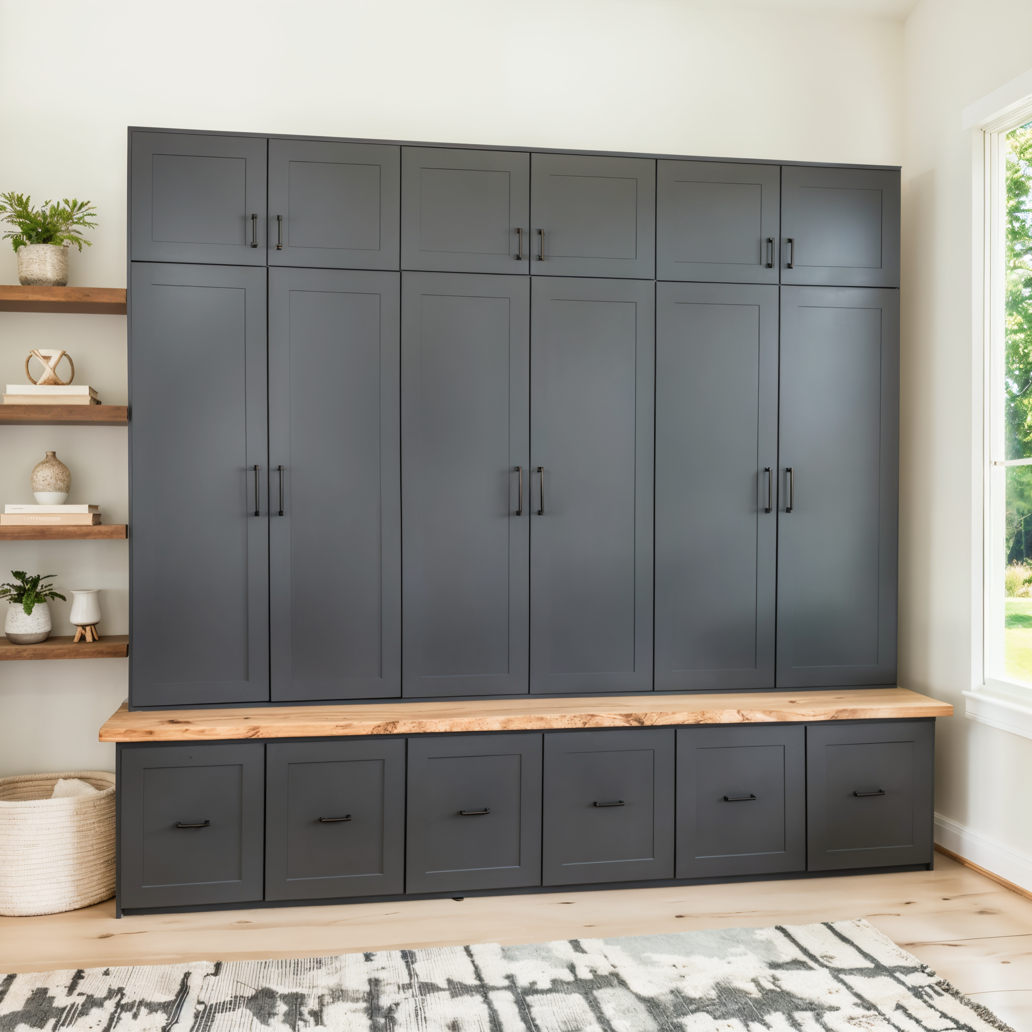 This hall tree offers a sophisticated and practical solution for organizing your entryway with timeless farmhouse appeal. Each piece is handmade by our own craftsmen using domestic hardwood faceframe material and cabinet plywood. Hidden behind the doors and drawers you will find ample space to store your family's bags, coats, shoes, hats, scarves and more.